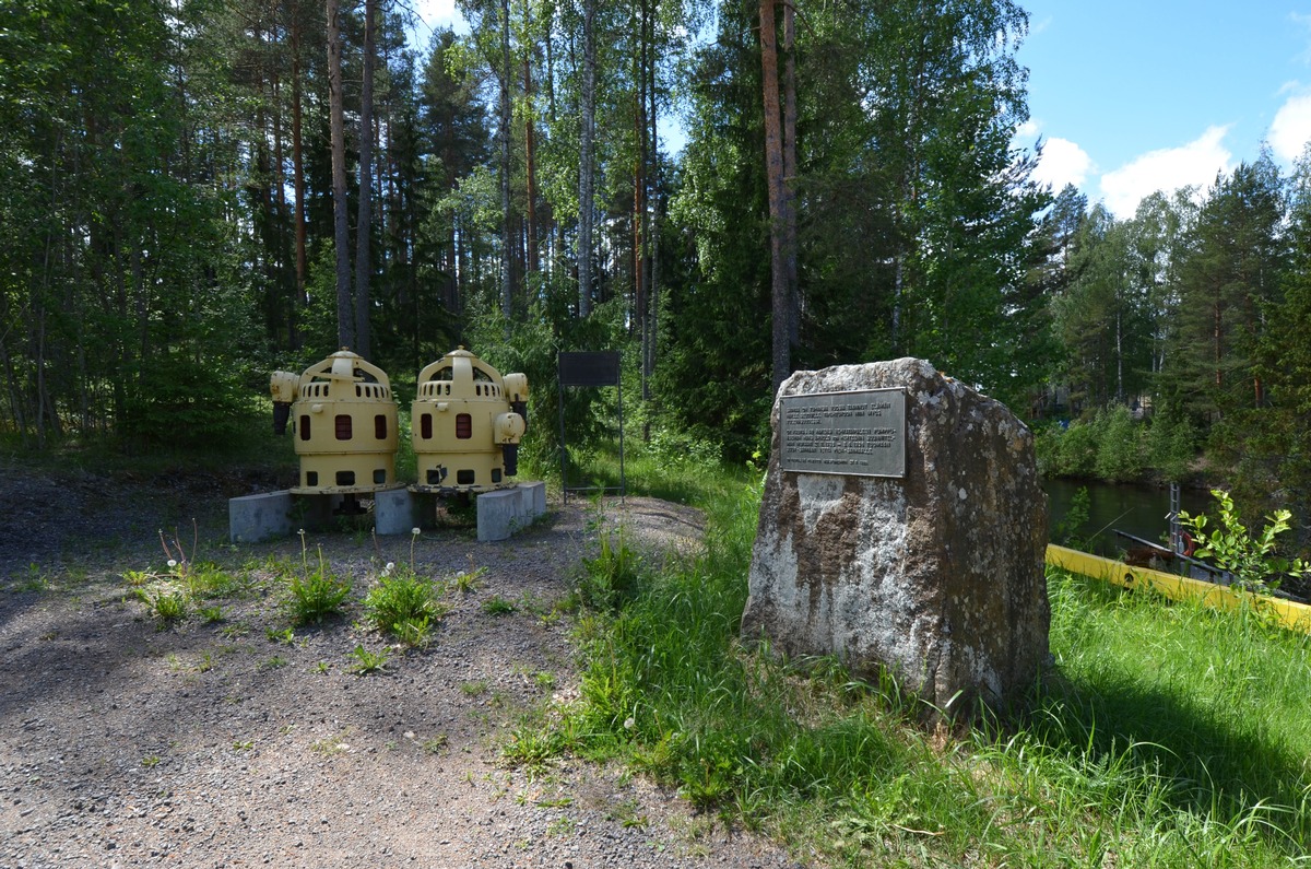 Kuva: Pumppuaseman vieressä on nähtävillä kaksi vanhaa pumppua (1936-2018) sekä pumppuaseman muistomerkki, joka on pystytetty kanavan ja aseman 50-vuotisjuhlan kunniaksi 27.7.1986. Laatassa on teksti: Saimaa on tuhansia vuosia taannut elämän näille seuduille. Tapahtukoon niin myös tulevaisuudessa. Valokuva Lappeenrannan museot: Makkonen Päivi: 2024.