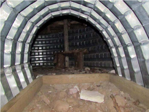 Kuva: Rekonstruoidun korsun A sisäänkäynti juoksuhaudan vallissa (kuvassa oikealla) on suljettu vanerisella luukulla. (Taipalsaari, Kattelussaaren – Jänkäsalon osayleiskaava-alueen arkeologinen inventointi 2012)