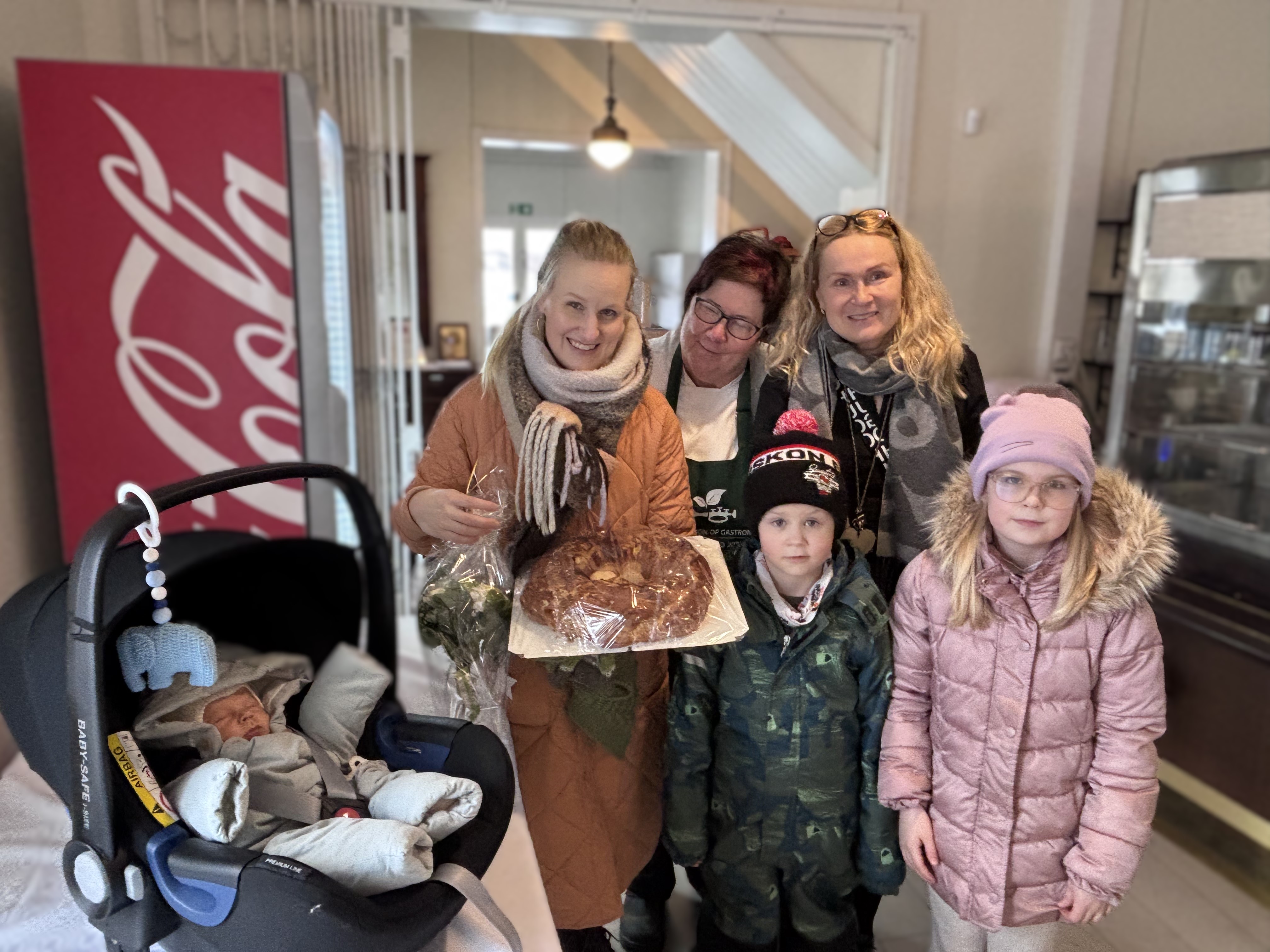 Kuvassa Janni Liimatainen, poikavauva, Elli Nieminen, Eino-Kalle Nieminen, Ulla Liukkonen ja sivistysjohtaja Kirsi Leinonen. Liukkonen ja Leinonen luovuttivat rotinarinkelin ja kukat Vanhalla kunnantuvalla 31.1.